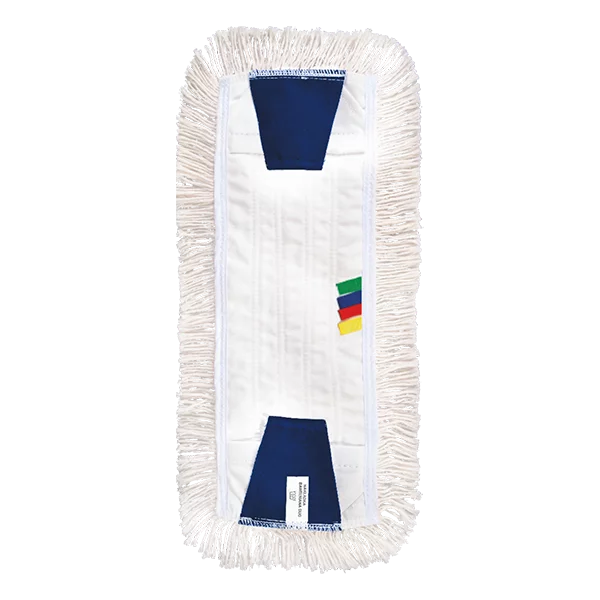 Nakładki bawełnianej przeznaczonej do mycia i dezynfekcji wszelkich zmywalnych powierzchni podłogowych. Posiada system mocowania za pomocą trapezowych zakładek, oraz system kieszeniowy. System zakładek trapezowych umożliwia bezdotykowe wyciskanie nakładki. Trapezowe zakładki zostały usztywnione specjalnymi wsadami z tworzywa sztucznego, zapewniającymi stabilne mocowanie trapezów w stelażu. Posiada cztery kolorowe wszywki umożliwiające oznaczenie przeznaczenia w zależności od rodzaju sprzątanych pomieszczeń. Bawełniane pętelki myjące przyszyte są do płóciennej podstawy za pomocą 5 par ściegów na środku oraz 2 na krawędziach nakładki. Kod produktu: IM-AKC-0011. Skład: 100% bawełna. Temperatura prania: 90°C. Wymiary nakładki: 51 x 14,5 cm. Waga nakładki 250 g.